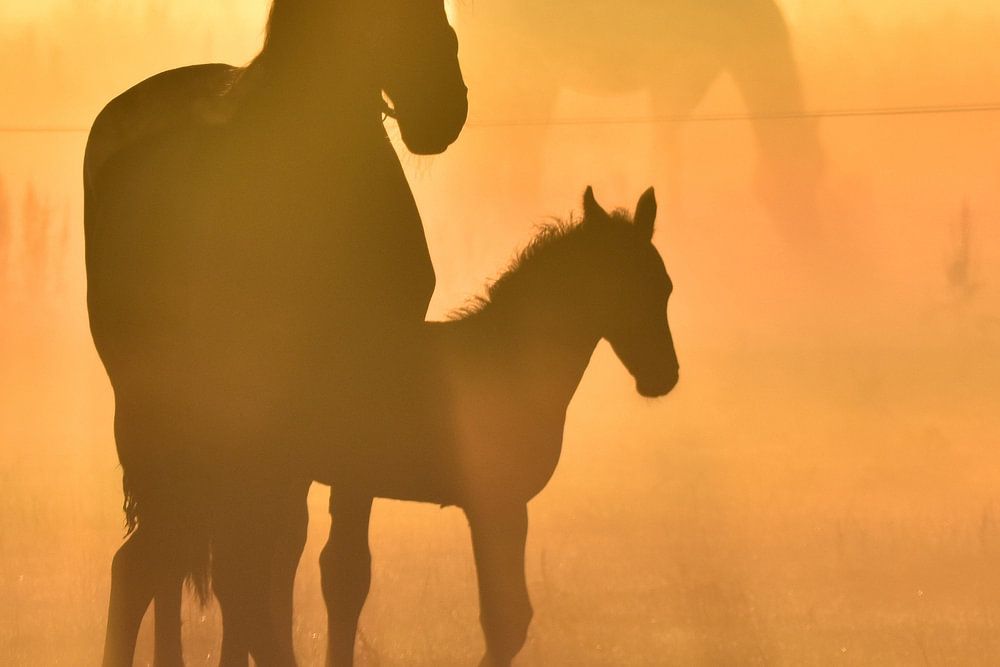 Buy this landscape artwork Friesian horses at sunrise by Jitske Van der gaast on canvas, ArtFrame, poster and wallpaper, printed on demand in high quality.