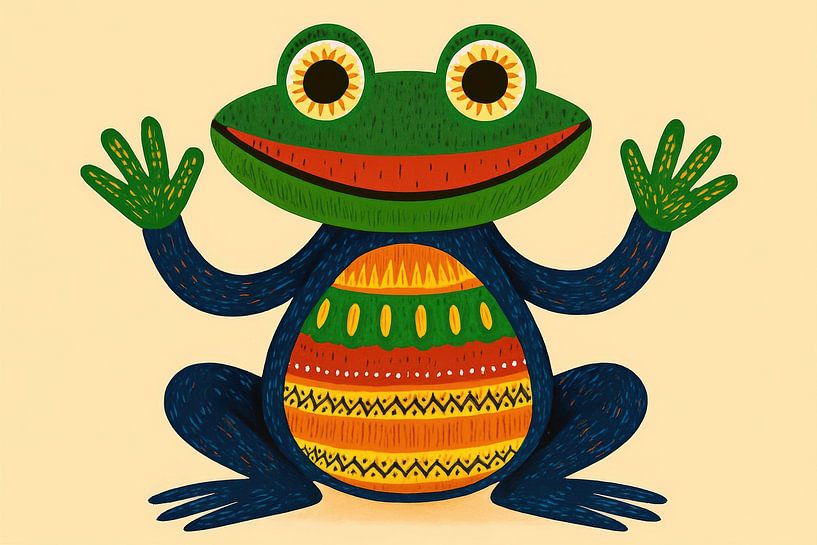 A happy frog sits frontally in the picture with a broad smile and large, round eyes. The belly shows colourful, geometric stripes and delicate motifs playfully overlapping each other. Dark blue limbs contrast with the green head and the warm beige background provides tranquillity. Grooves and grainy details add depth to the illustrative…