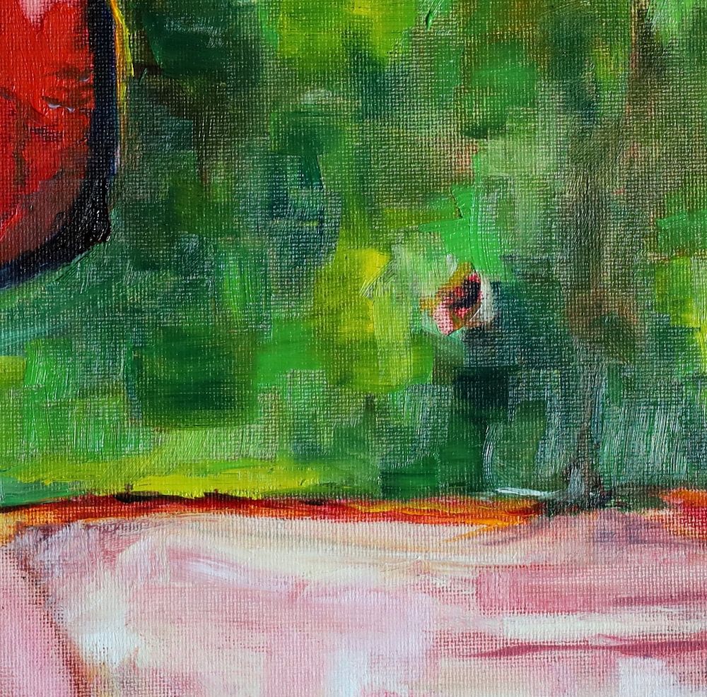 This frog is painted with oil paint on canvas board. It is made up of small blocks. The green and red enhance each other, the moist skin and the eye shine in the light. He looks around, his eyeballs spinning in the sockets in search of prey.