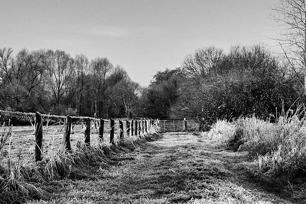 This striking black and white photograph captures the calm and clarity of a frosty morning in the countryside. A narrow path covered in hoar frost winds along an old wooden fence that cuts through the landscape, giving it depth and perspective.