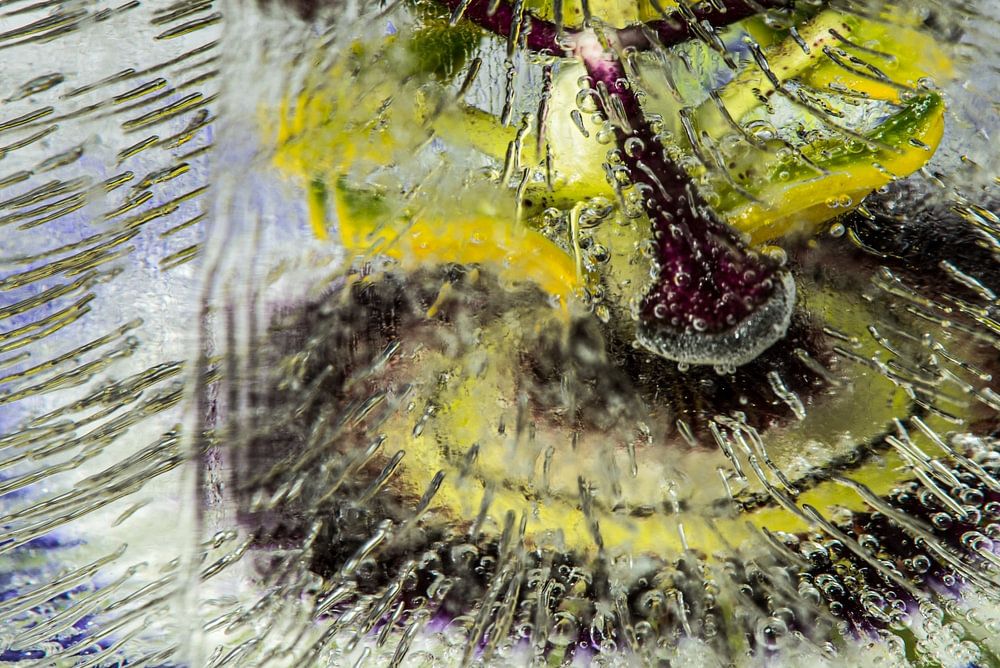 The ice crystals form a subtle window between us and the flower, as if we are looking at a memory that will never fade. Each bubble seems like a small universe caught in silence. This photographic technique not only preserves the shape of the flower, but also enhances its mystical character.