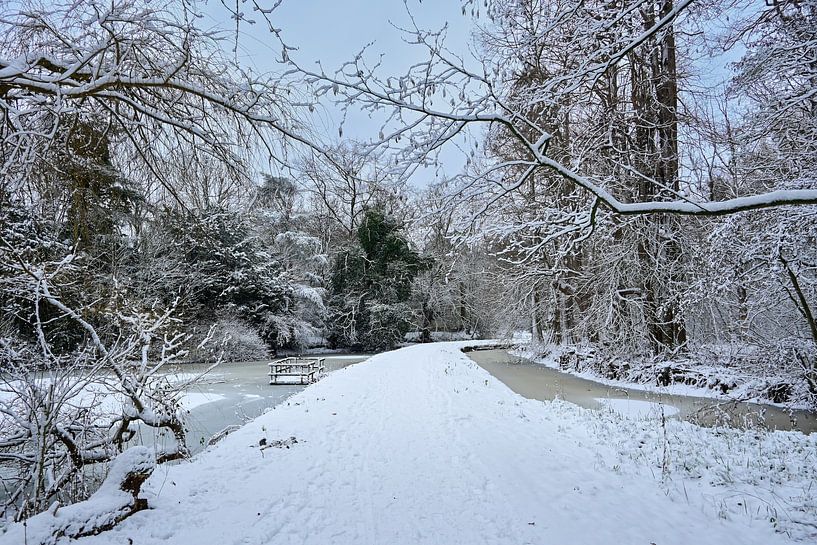 This serene image shows a hidden detail of the Rivierenhof in Deurne during a harsh winter. In the centre of the frozen pond lies a wooden raft, almost unrecognisable under a thick and untouched carpet of snow. The image captures the absolute silence of the park at a moment when the water has calmed down and the world is covered under a…
