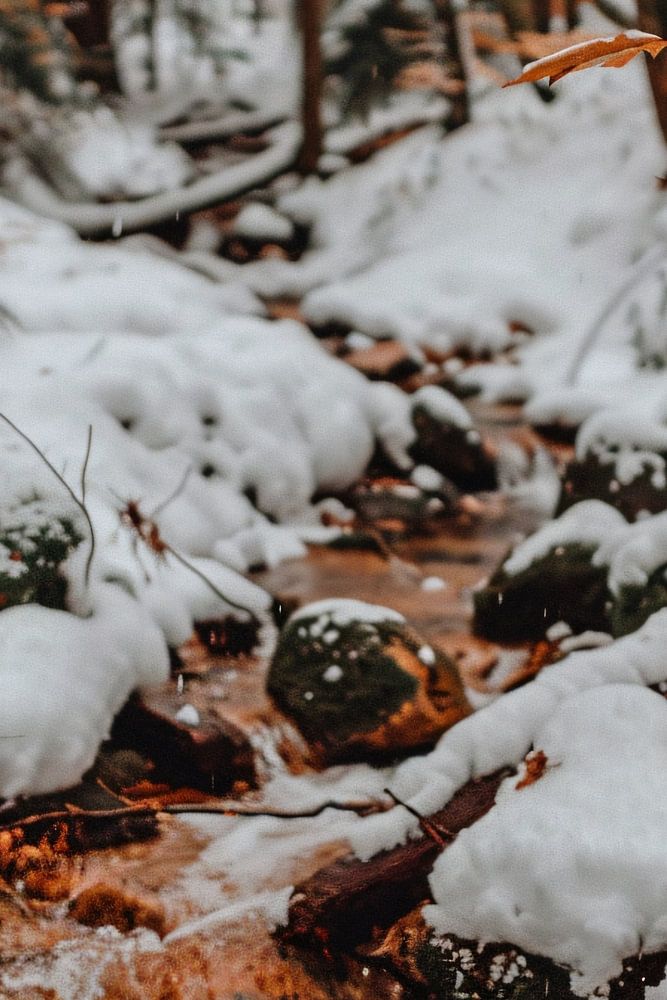 Let the serene beauty of nature fill your home with this breathtaking photo. A frozen river winds through a snow-covered forest, where the trees stand as silent sentinels. The contrast between the bright white of the snow and the warm brown of the water creates a harmonious scene. This photo brings a sense of calm and wonder to any space.