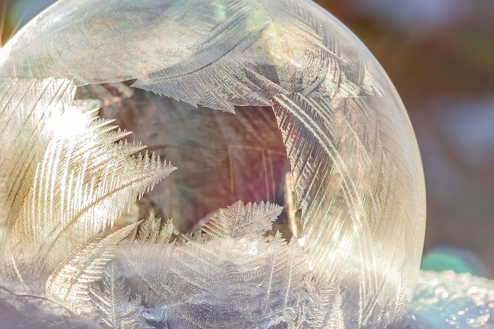 Soap bubble in freezing cold gives a beautifully structured sphere, ice flowers, stars, feathers. The splendour of winter in a pastel shade