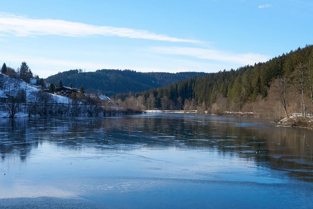 Frozen river with snow and ice in sunshine under blue sky at Nagoldtalsperre in Germany