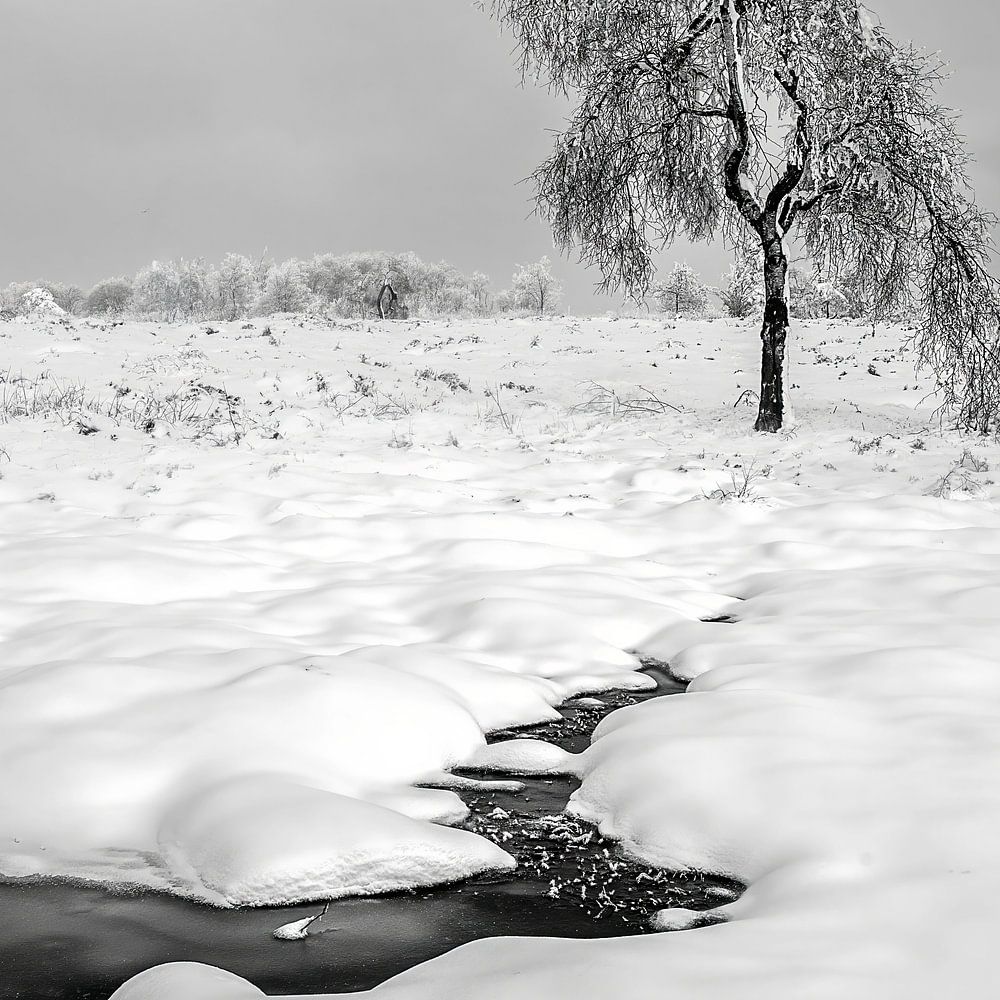 In a vast winter landscape, a lone tree stands, bowed deeply under the weight of ice and snow. In front of the tree, a frozen stream meanders through the landscape, its dark surface visible under soft, white layers of snow. The empty surroundings, shrouded in a monochrome palette of grey and white, exude a deep silence. The tree almost seems to bow to winter, but remains standing, a symbol of resilience in a harsh, unforgiving environment. The stream, silent and frozen, adds a subtle element of movement to the otherwise static scene. The atmosphere is serene and introspective, a moment of stillness in which nature's strength and fragility become visible. This image tells a story of struggle, adaptation and the delicate balance between strength and surrender.
