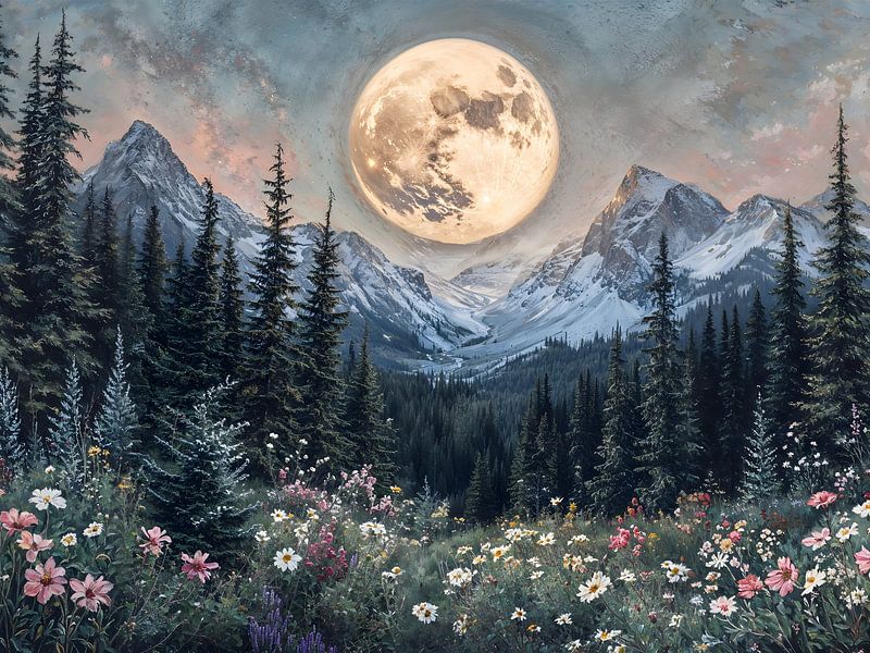 Buy this landscape artwork Full Moon Floral Meadow Landscape by IamHome Studio on canvas, ArtFrame, poster and wallpaper, printed on demand in high quality.