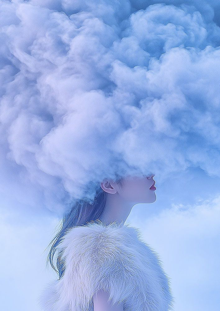 A woman stands in a white winter dress with a soft fur collar, evoking a sense of warmth and elegance amid the cold atmosphere. Her hair is hidden under a large, downy cloud reminiscent of a winter swirl of snowflakes or icy candyfloss, rendered in delicate pastel shades of blue and silver. The background is a subtle, muted lavender colour that evokes a cold, winter sky and enhances the serene atmosphere.