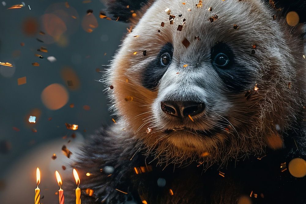A cute panda wears a party hat and blows out candles on a birthday cake. Festive atmosphere with confetti.