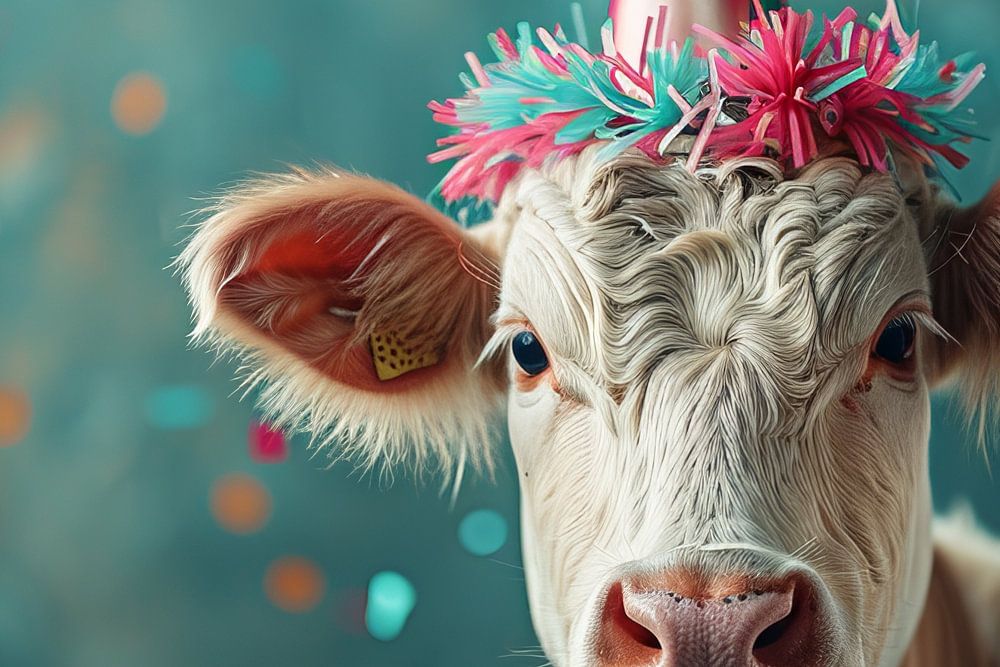 Funny birthday cow with colourful party hat and flying confetti against a blurred background in disco 60s style.
