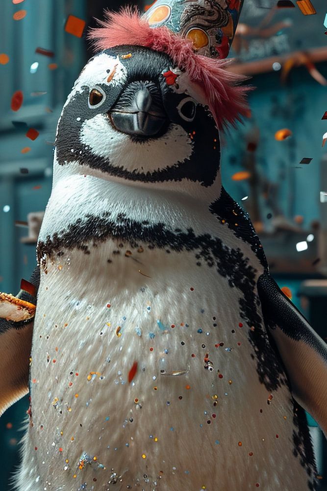 A penguin celebrates his birthday, wears a party hat and is surrounded by colourful confetti in the style of the 60s and 70s.