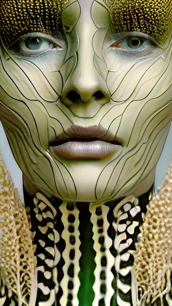 Portrait of a futuristic woman in shades of nature. A poetic beauty created by the fusion of nature and man.
