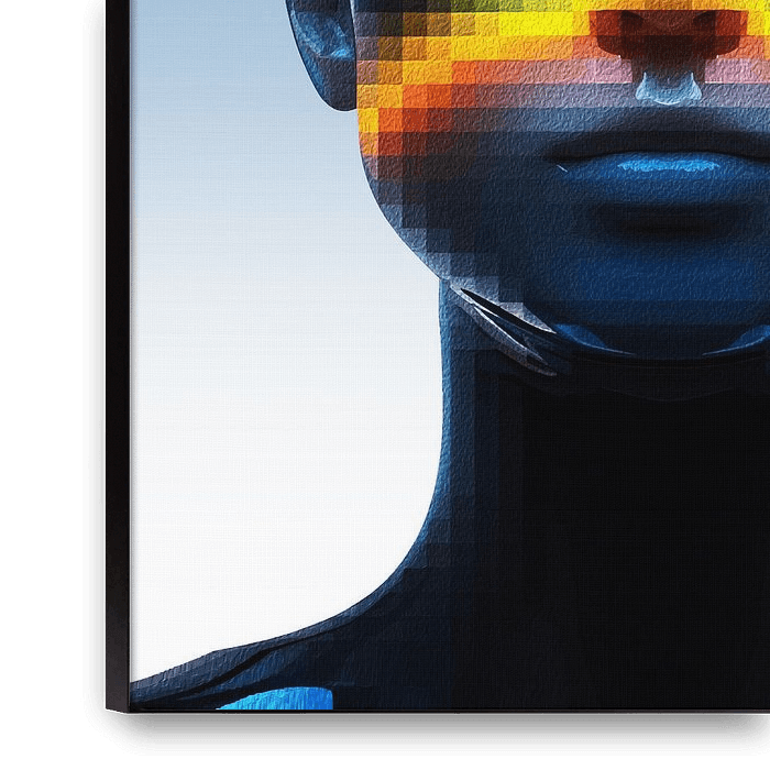 Step into the future with this striking digital artwork of a pixelated humanoid figure blending cyberpunk aesthetics with abstract minimalism. Vivid gradients of electric blue and neon orange contrast against a sleek, glossy form, creating a bold statement piece for modern interiors.