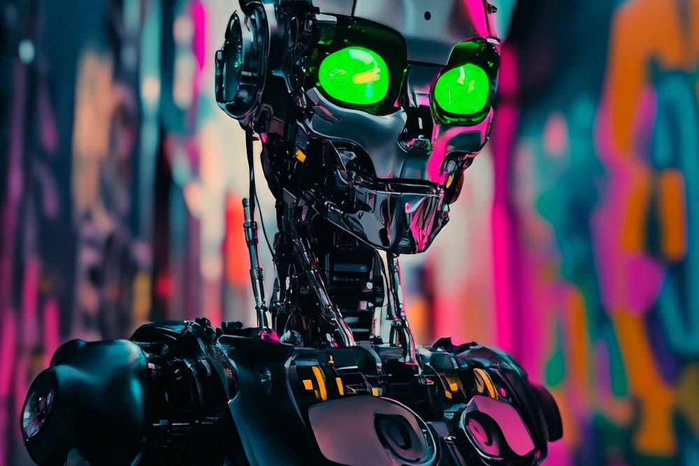 Amidst vibrant graffiti and a futuristic setting stands a fascinating robot silhouette, its bright green eyes gazing curiously at its surroundings. This artistic composition enriches the living room and creates an exciting atmosphere that impressively combines technology and creativity. Perfect for lovers of modern art and futuristic designs!