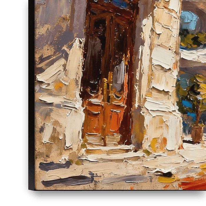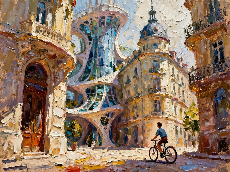 A cyclist rides through an architecturally striking urban landscape, characterised by flowing forms and futuristic structures. The buildings appear both organic and visionary – a blend of classical architecture and modern imagination. The warm and cool tones create depth and dynamism. The rough, impasto-like brushwork gives the painting…