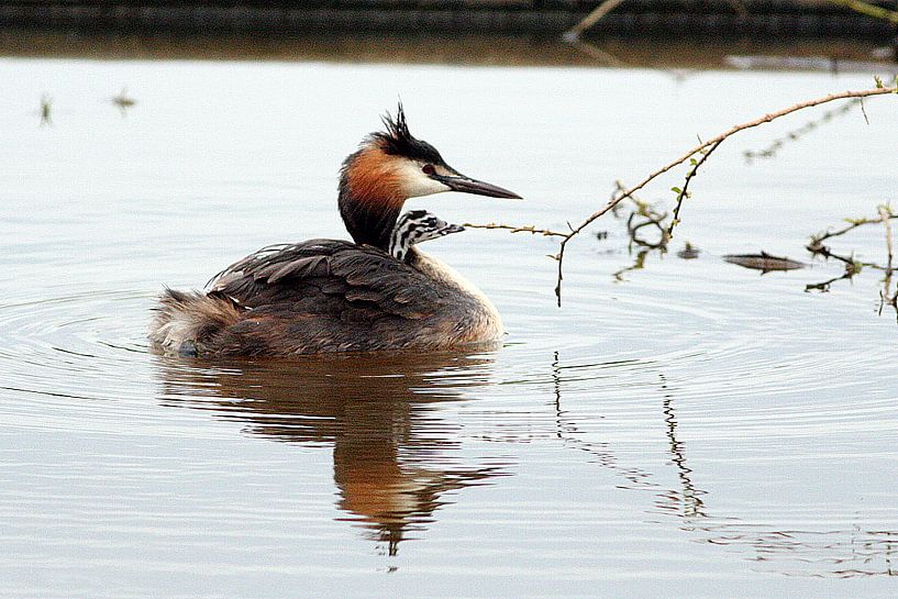 Fuut met kuiken op de rug by Gijs Tjeerdsma