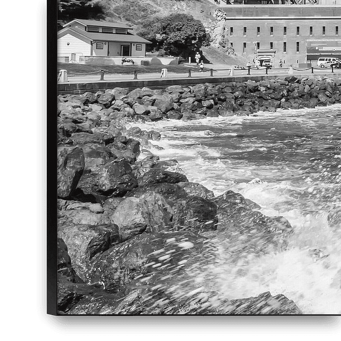 Buy this landscape artwork GOLDEN GATE BRIDGE Coastline Impression | Monochrome by Melanie Viola on canvas, ArtFrame, poster and wallpaper, printed on demand in high quality.