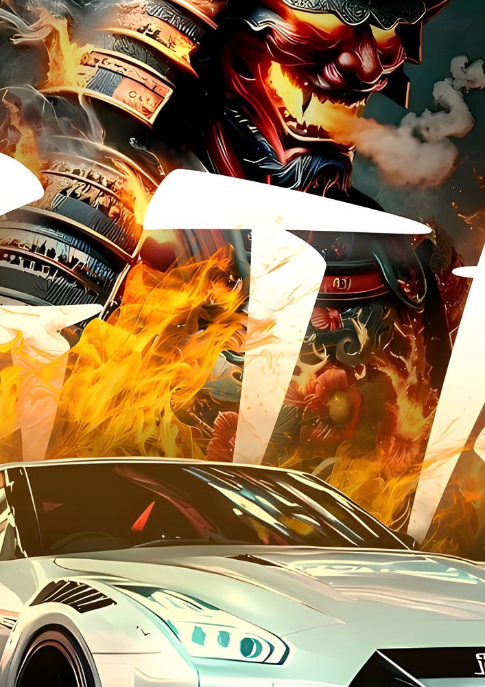 A white Nissan GTR sports car is depicted in the foreground, partially obscured by a large, fiery image of a samurai warrior in full armor. The samurai's helmet is adorned with horns and a menacing mask, and he is engulfed in flames and smoke. The background is a dark, smoky haze with hints of orange and yellow from the flames. The image evokes a sense of power, speed, and Japanese culture.