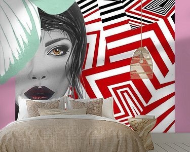 The portrait shows a female face partly overshadowed by a butterfly, symbolising transformation and strength. The background consists of graphic patterns that create an optical play and enhance the intensity of the portrait. The fiery eyes and deep red lips contrast sharply with the monochrome surroundings - a tension that often recurs in my work.