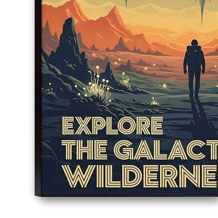 An epic sci-fi poster with the text "EXPLORE THE GALACTIC WILDERNESS," showing figures near strange, floating mountains on an orange-hued alien world.