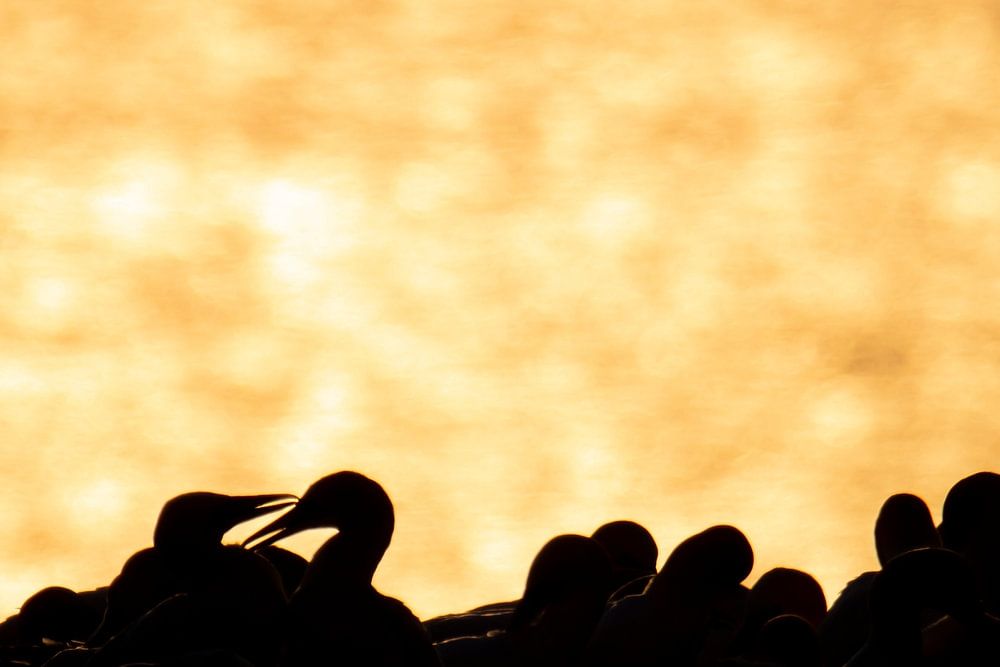 Gannets at sunset. Gannet photographed in Helgoland. The imposing bird stands out beautifully against a white background. Every year these birds breed on high cliffs in Europe. The blue rim around the eyes, the black markings at the beak and the yellow-coloured head make this seabird a great photo model for the photographer. Silhouette through backlight.
