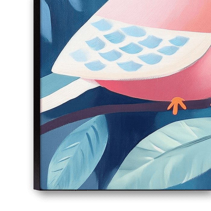 Garden Birds - This painting shows two cheerful birds with colourful feathers, surrounded by beautiful flowers and leaves, giving it a lively and happy look, perfect for a garden or summer atmosphere.