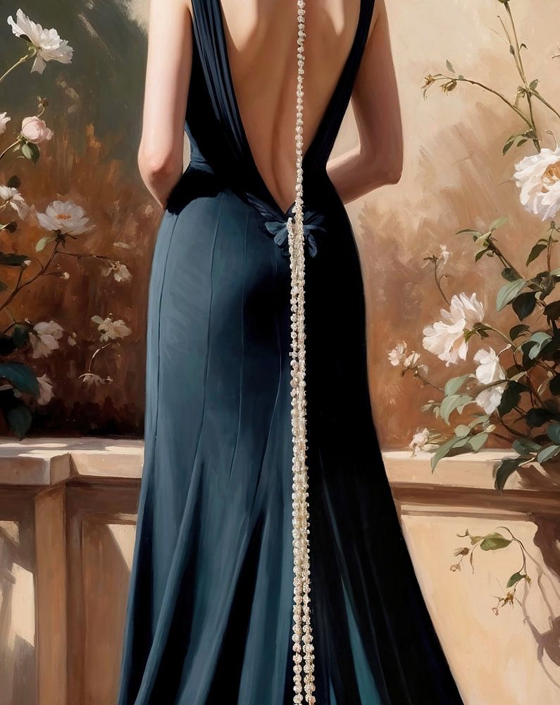 A work that seamlessly combines classic elegance with modern digital techniques. The image shows a stylish woman standing with her back to the viewer, dressed in a flowing, deep blue evening gown that subtly contrasts with the warm colours of the garden wall and blooming white roses. Her hat, adorned with delicate feathers, and the dramatically long pearl necklace that falls gracefully over her back and dress enhance the sense of sophistication and nostalgia. The shadow falling on the wall adds depth to the composition, creating a play of light and shadow that enhances the melancholic mood.