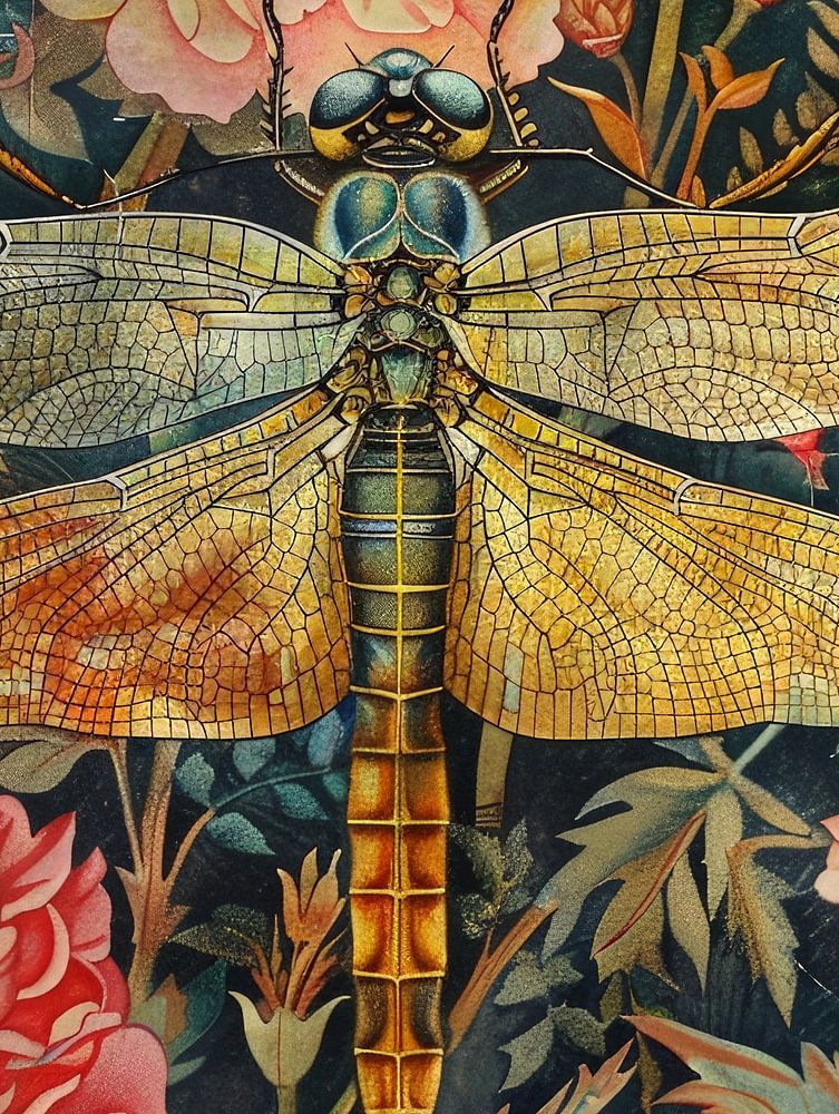 This artistic, lovely artwork is a detailed rendering of a dragonfly elaborately depicted on a background of lush flowers.