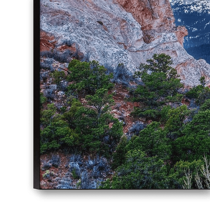 Fine art photo of a beautiful sunset over Pikes Peak framed in the red rocks of Garden of the Gods Park in Colorado Springs, Colorado.