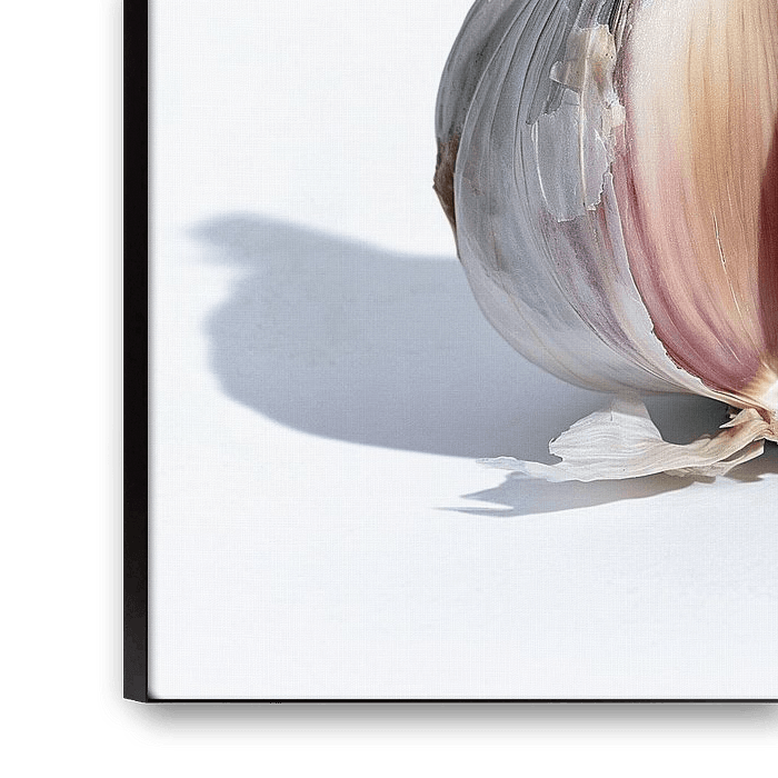The composition has been carefully chosen to highlight the garlic bulb's shape and texture. The contrasts between the rough texture of the skin and the smooth surfaces of the inner segments are beautifully rendered. The photo evokes comparisons with the minimalist style of modern food photographers such as Nuno Correia and Jonathan Gregson, who are known for their attention to detail and composition.