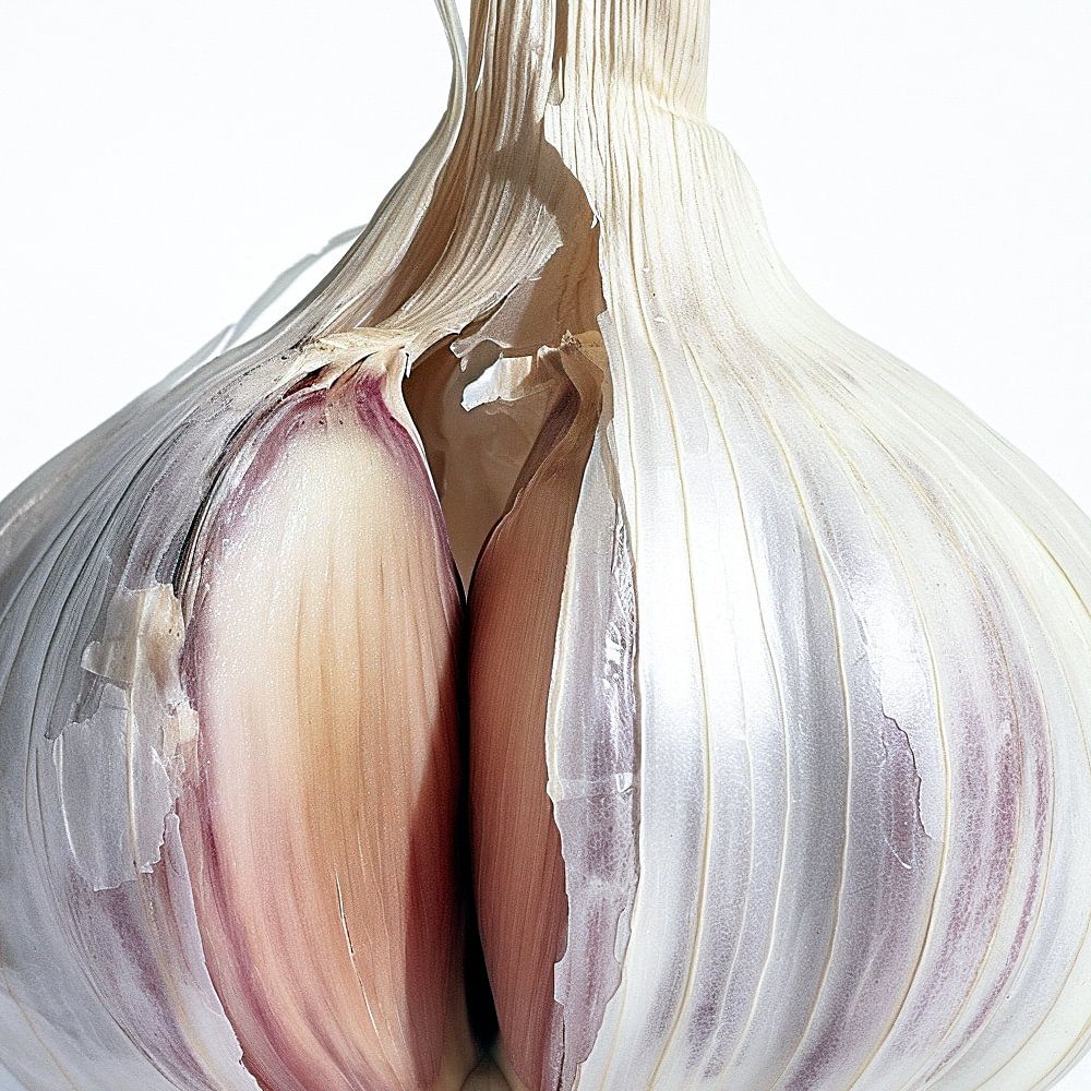 This modern photograph captures the intricate beauty of a garlic bulb, against a crisp white background that focuses full attention on the subject. The garlic bulb stands upright, revealing its delicate layers and textures in detail. Each segment of the bulb is portrayed with care and precision, bringing out the subtle nuances of colour and shape.