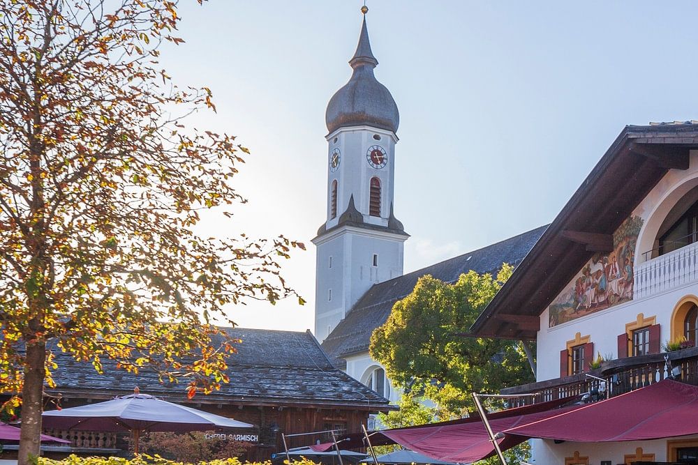 Inn with Lüftlmalerei and Baroque Parish Church of St. Martin in the Evening Sun, Garmisch district, Garmisch-Partenkirchen, Werdenfelser Land, Upper Bavaria, Bavaria, Germany