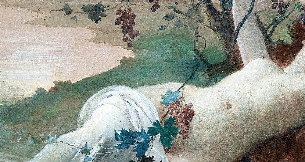 This girl lies naked on shore, on the side of a river under a grape. The nude model with the long hair has a sheet over her legs so that her hips, belly, torso, breasts and arms are exposed on the nude portrait.