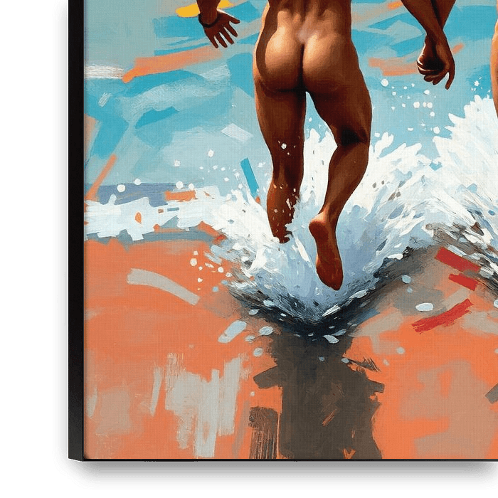 This work in the style of a painting shows an intimate pair of lovers - two men running hand in hand through the shallow water and laughing as they dive into the sea spray. United in the golden light of the sunset, their movements merge with the colours of the sky and sea to create a quiet, poetic harmony.