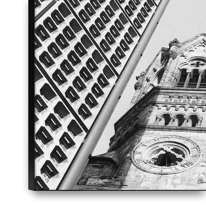 Buy this modern artwork Gedächtniskirche Berlin black-and-white architecture by Martin Hendriks on canvas, ArtFrame, poster and wallpaper, printed on demand in high quality.