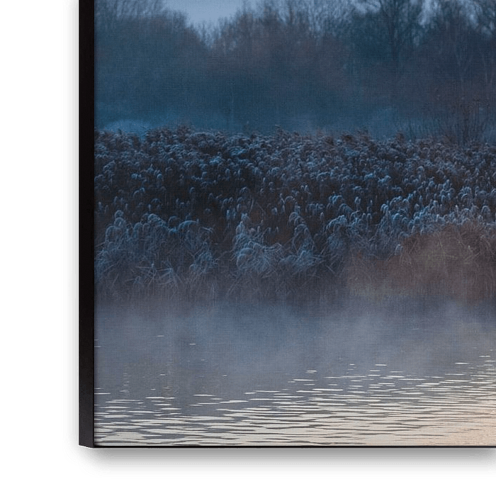 A winter morning in the Twiske recreation area. Geese fly up during sunrise. Dew hangs over the water. It is freezing and quiet.