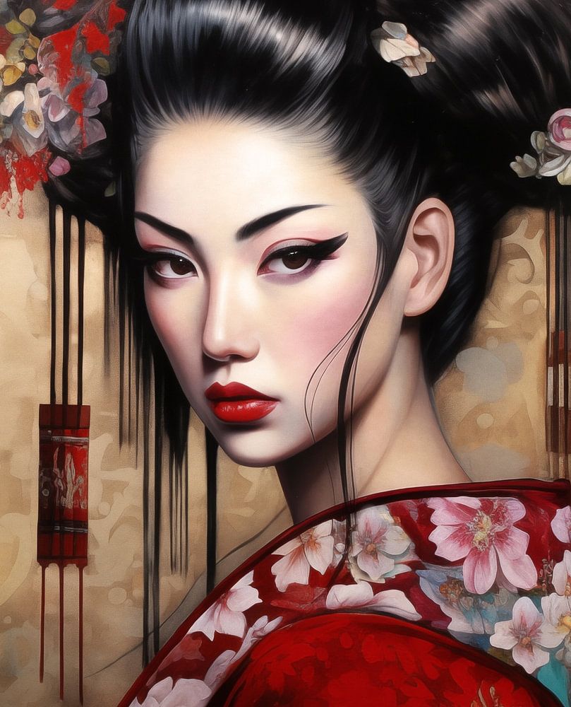 A woman with lush hair adorned with flowers and dressed in a richly decorated kimono stares intently at the viewer. The background consists of a mix of floral patterns and subtle textures, enhancing the overall aesthetic.