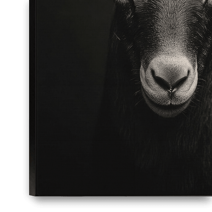 A majestic animal with impressive, curved horns stands out against a deep, dark background. Its gaze radiates both calm and strength, drawing all eyes to it. This important work of art would look great in a living room, where it can stimulate conversation and create a sense of closeness to nature.