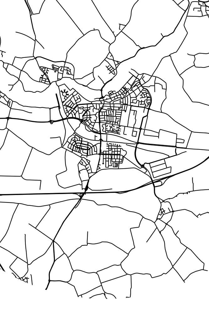 Black and white map, street map or street plan of Geldermalsen. Geldermalsen is located in the Betuwe, in the municipality West Betuwe, province Gelderland. On the city map all public roads in Geldermalsen are included. Furthermore, the map is provided with the coordinates of the center of Geldermalsen.
