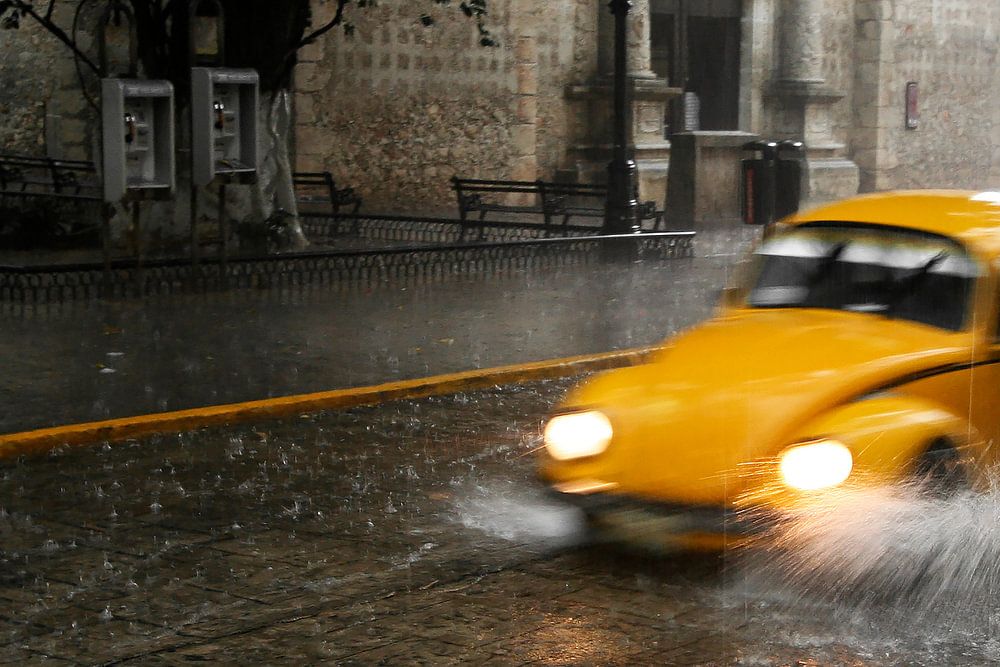 Deze gele kever kwam voorbij rijden door de ondergelopen straten van Mérida, terwijl ik stond te schuilen voor een tropische regenbui. De overeenkomstige gele kleur van de auto en die van de stoepranden maken van de foto een treffend beeld.