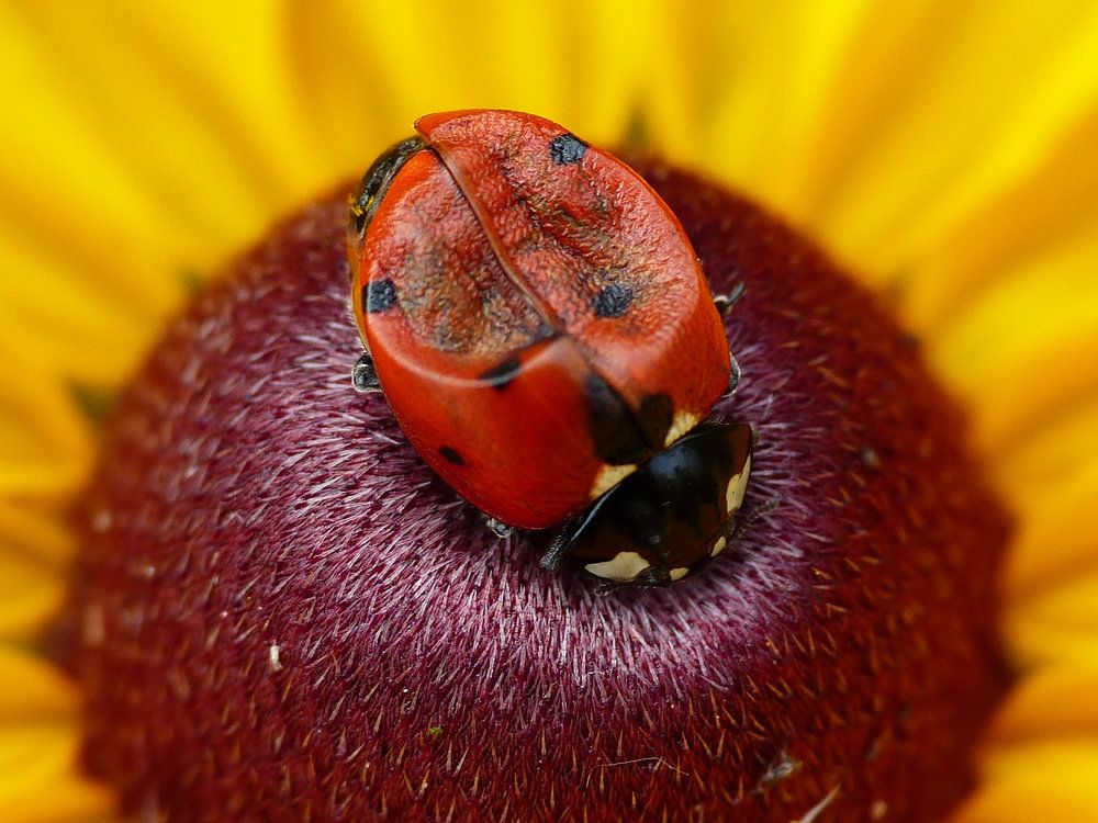 Gele bloem met lieveheersbeestje dat een beetje gehavend is. Het heeft nog een hele tijd zo in die bloem overleefd