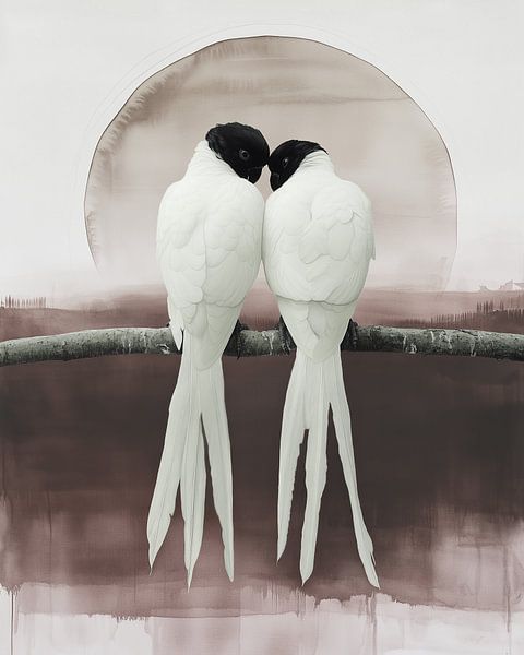 Two elegant birds rest side by side on a slender branch, their bodies almost perfectly mirrored in a quiet, intimate pose. Their white plumage blends softly together, whilst their dark heads brush lightly against one another—a tender moment of connection that forms the heart of the image. Their long, slender tails hang gracefully…
