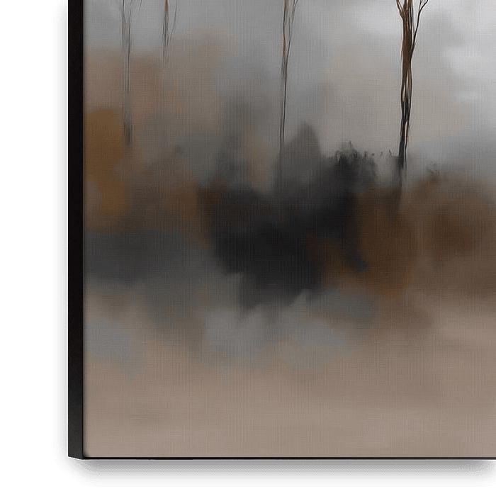 The work utilises softly flowing brush textures and subtle contrasts. A horizontal axis directs the viewer into the depths, while vertical tree lines balance the composition. The muted palette of warm browns, misty grey and pale ivory creates an elegant, Scandinavian-minimalist effect. Light is placed as a gentle opening in the centre - a visual haven of peace. A picture for people who understand silence as a luxury - and want to see it every day.