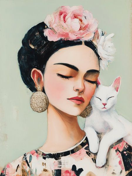 A serene portrait of a woman and a cat. The beautiful composition exudes tranquillity and a sense of connection, with the gentle interaction between human and animal taking centre stage. The woman wears a floral wreath in her dark hair, rendered in loose brushstrokes of pink and white, evoking a slightly romantic and almost dreamlike…