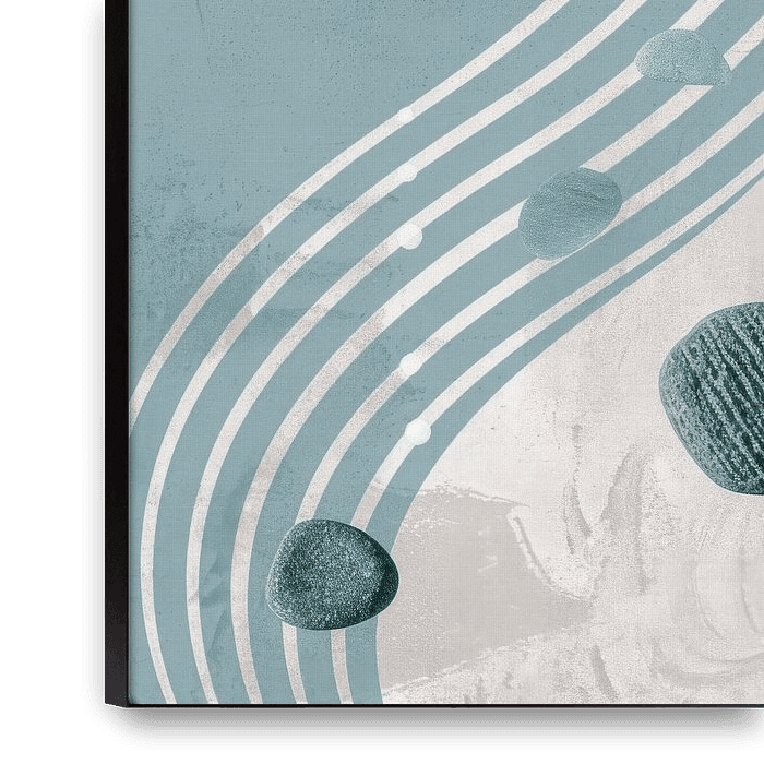 Gentle lines meander through a harmonious composition, while round stones in different shades rest on a calm surface. The soft blue and grey tones lend the picture a meditative calm, as if nature itself is singing a quiet song of serenity. An interplay of form and colour that invites you to linger.