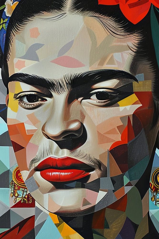 A breathtaking interplay of shapes and colours frames Frida's iconic face in this cubist-inspired portrait. The multi-faceted composition reflects a modern interpretation of her complex personality and legacy. The fresh, vibrant colours bring forth a dynamic energy that captures the eye and invites viewers to explore the complexities of life and art.