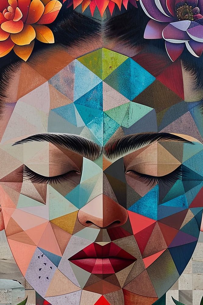 A breathtaking interplay of shapes and colours frames Frida's iconic face in this cubist-inspired portrait. The multi-faceted composition reflects a modern interpretation of her complex personality and legacy. The fresh, vibrant colours bring forth a dynamic energy that captures the eye and invites viewers to explore the complexities of life and art.