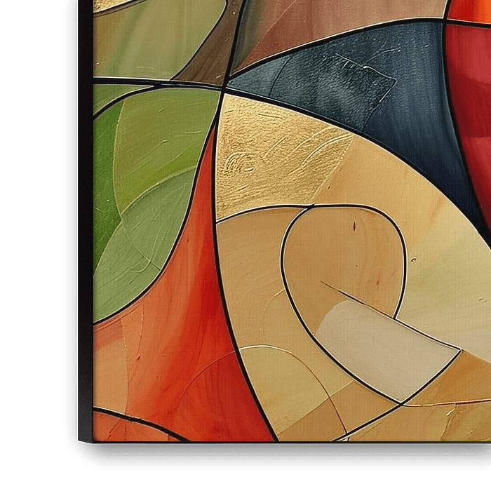 Geometric Harvest - This abstract apple painting shows a stylised, large apple at the centre of the canvas, depicted in a polygonal, almost mosaic-like style that creates a dynamic visual effect. The colours in this artwork range from warm reds, oranges and yellows to cooler tones such as greens, blues and earth tones, carefully arranged to highlight the apple's curves and shadows, giving depth and texture to the piece. The background consists of subdued beiges and greys, with the focus entirely on the apple. The lines within the painting are soft and fluid, contributing to the serene, yet vibrant look. The apple almost seems to glow due to the brightness of the colours and the subtle hints of light reflection on different segments. This set-up makes it not only pleasing to the eye, but also a play of geometry and colour theory, perfectly woven into the recognisable shape of the fruit. The painting is a wonderful example of modern art approaching traditional subjects in a contemporary and intriguing way.