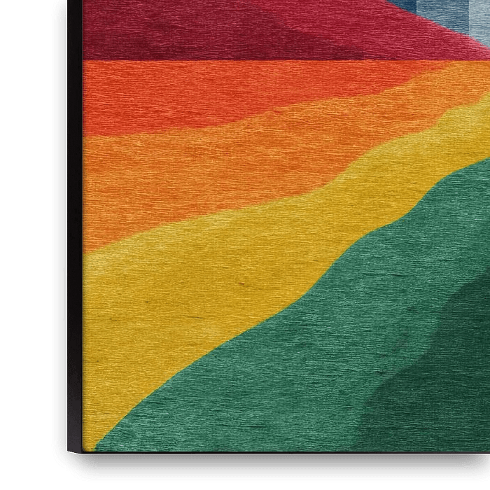 An abstract composition that combines geometric rigour with organic waveforms. Vertical stripes of colour in shades of blue meet a red mountain silhouette. In the right-hand section of the picture, rectangular segments in beige, ochre and orange are layered on top of each other. The lower part of the picture is dominated by flowing…