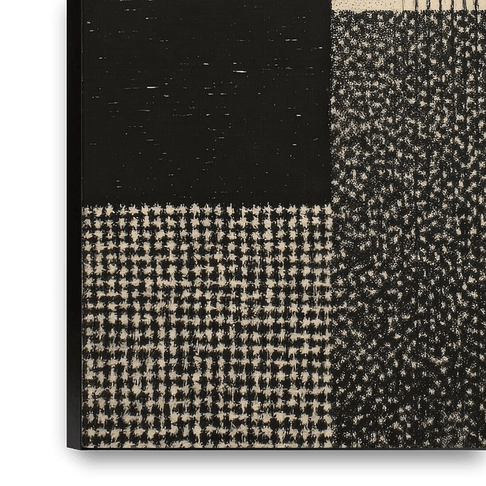 This abstract artwork depicts an interplay of basic geometric shapes such as circles and squares. The composition is defined by a variety of graphic techniques such as stippling, fine vertical lines and grid structures. The stark contrast between the deep black areas and the delicate patterns creates a timeless, minimalist aesthetic.…